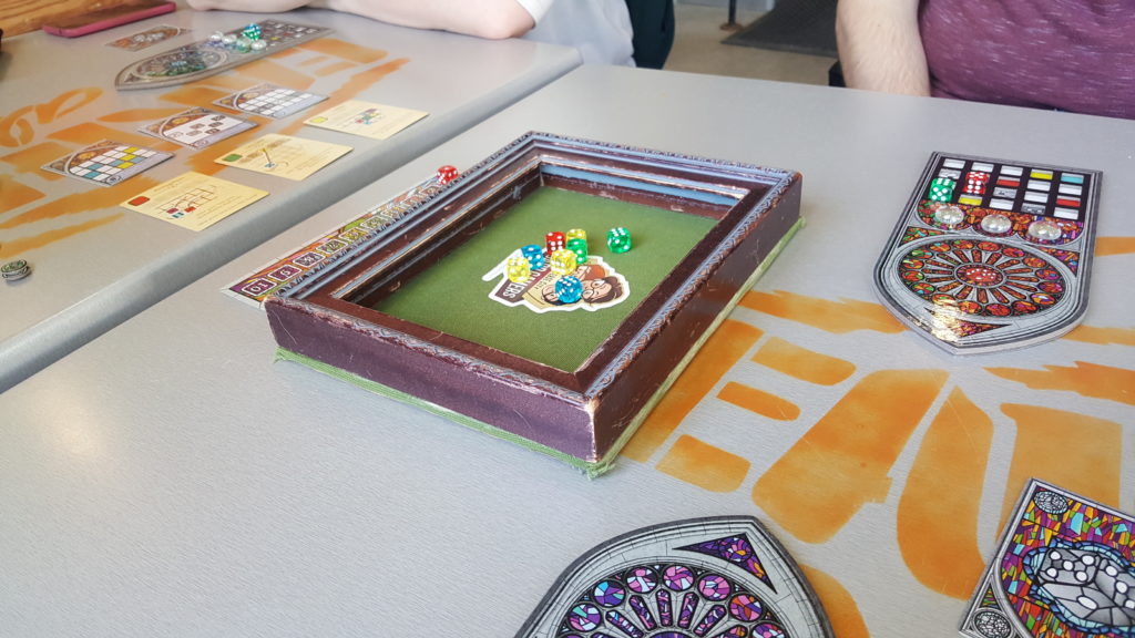 Our game started a bit differently than how the rules direct as we were given one window panel card and decided personally which side to use. I was dealt a promotional card that I had picked up for the game which had a difficulty rating of 6. This window panel had no open sections on it where anything can go but had either a die face or color in every section. I didn’t realize the difficulty that this board would be at first so I chose this side as a “light challenge”. I was the starting player in this four player showdown and made my first mistake on the first turn by not using the rule breaking cards. One of those cards allowed players to draft two dice instead of one on your turn. This is crucial when you consider that if you are going first in turn order that you will get first and last choice of dice. My window panel was so constricting that I really needed to utilized this to its fullest. I started the game too casually for the level of difficulty I chose to play.