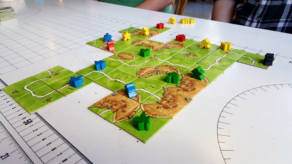 This was another classic that I needed to brush the dust off of as it came to the table. Carcassonne was the third modern board game that I ever purchased right behind Dominion and Bohnanza. Its strategies have gotten a little old over the years and say the table less due to this gaming fatigue. New games came in and this stayed longer on the shelf between plays. Recently I discovered our absence of playing the classics and teaching the new players of the group which prompted my desire to bring this title back out. We also have a giant homemade version of this that the group plays regularly in the summer so it’s good to have more players understand how to play. It’s not often we are able to play a board game outside without any tables.